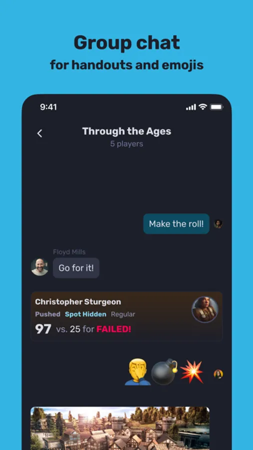 Communicate with your group, share handouts and GIFs, schedule upcoming sessions, and even roll dice directly in the chat. Type commands such as "/roll d20" or "/r 4d6kh3" to roll custom dice.