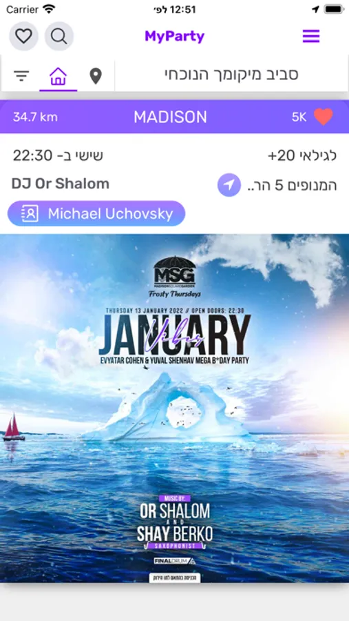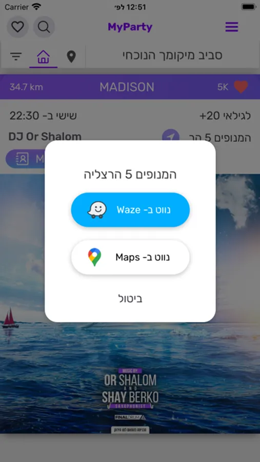 תוכל לראות את המסיבות המובילות, ליצור קשר עם היחצן/מפיק ואף לנווט ישירות למסיבה.