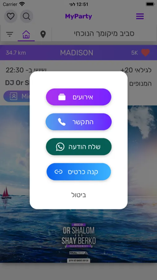 באפליקציית MyParty תוכל למצוא מסיבות לפי מיקומך תחת סינונים מותאמים אישית:
