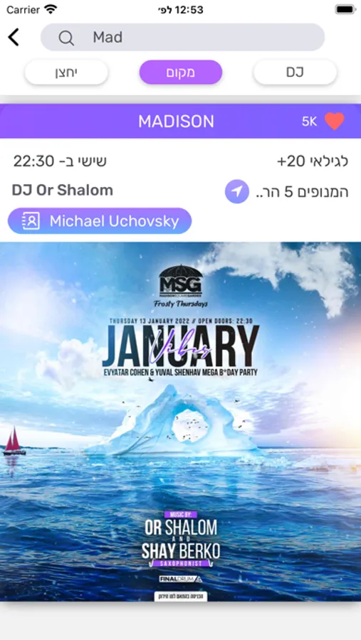 תוכל לחפש מסיבות לפי יחצן/מפיק או DJ מועדף ולסמן מסיבות בלייק.