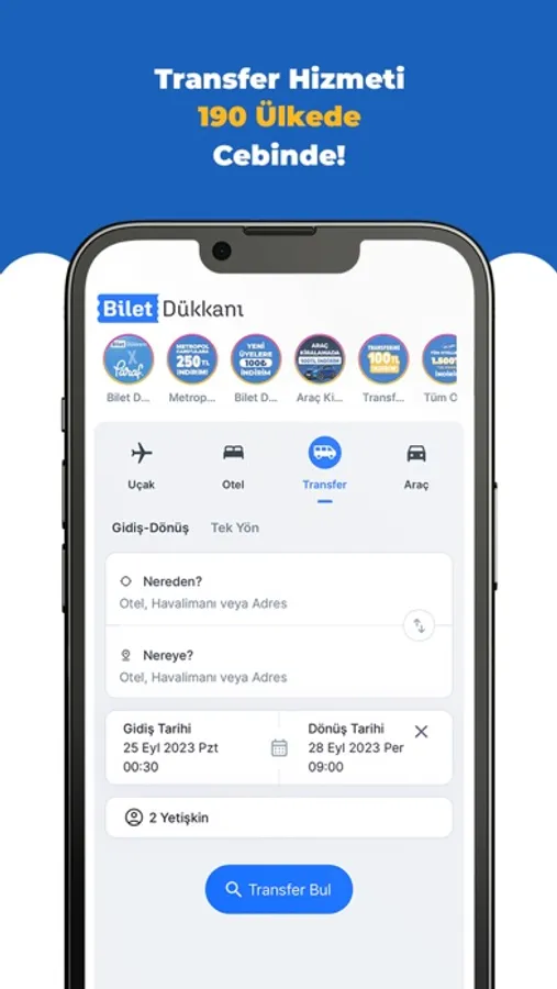Seyahat planı yaparken ulaşımda özel transfer ve araç kiralama hizmeti ile konforunuzu koruyun. Dünyanın 190’dan fazla ülkesinde, 500’den fazla çözüm ortağı ile transfer hizmeti veren Bilet Dükkanı, uygulamada yer alan çok sayıda araç kiralama acentesi yolcuları seyahat boyunca rahat ettirmeye çalışıyor.