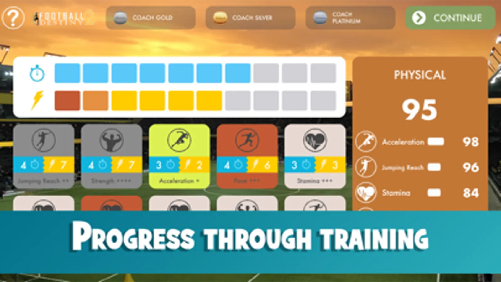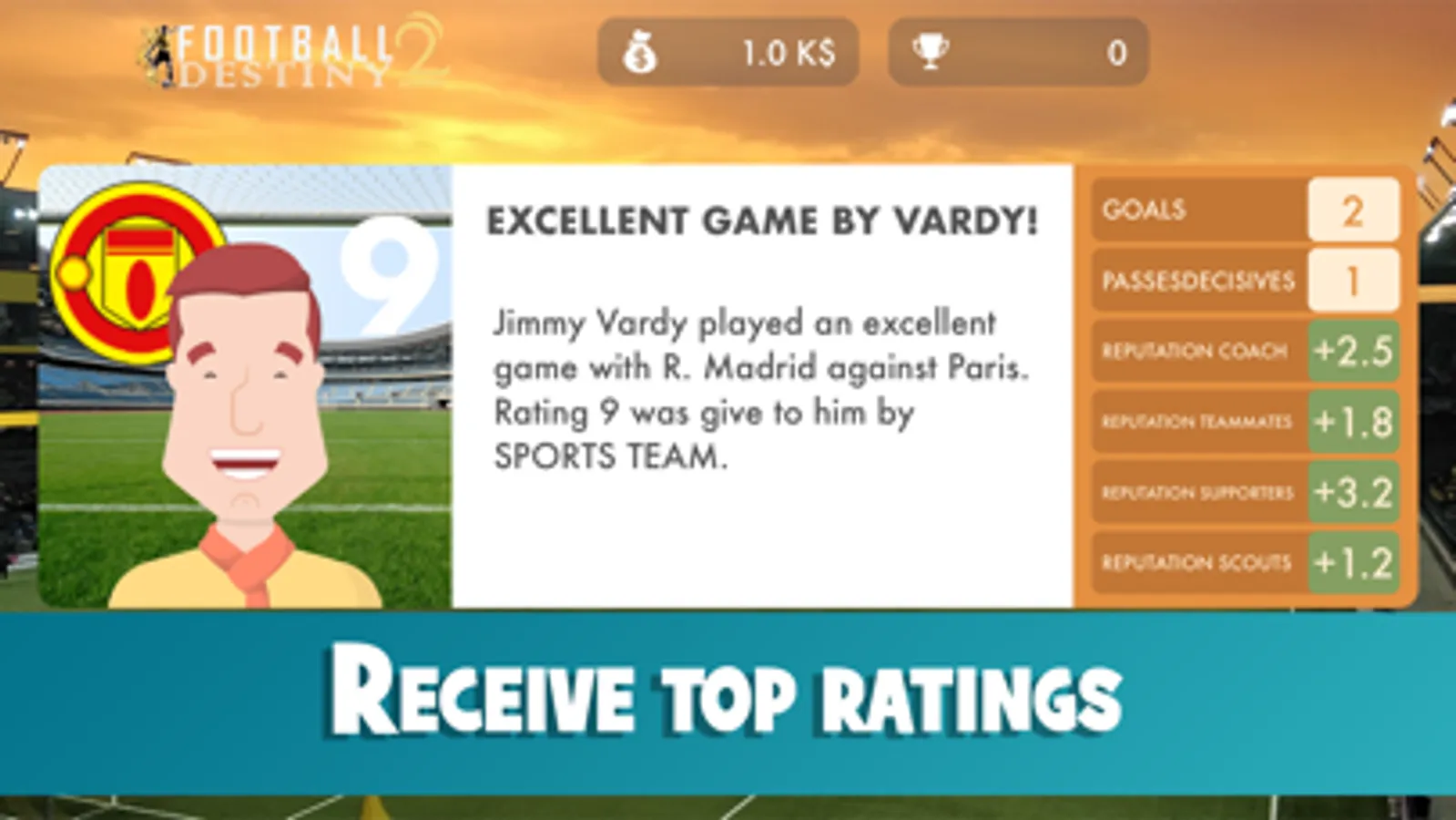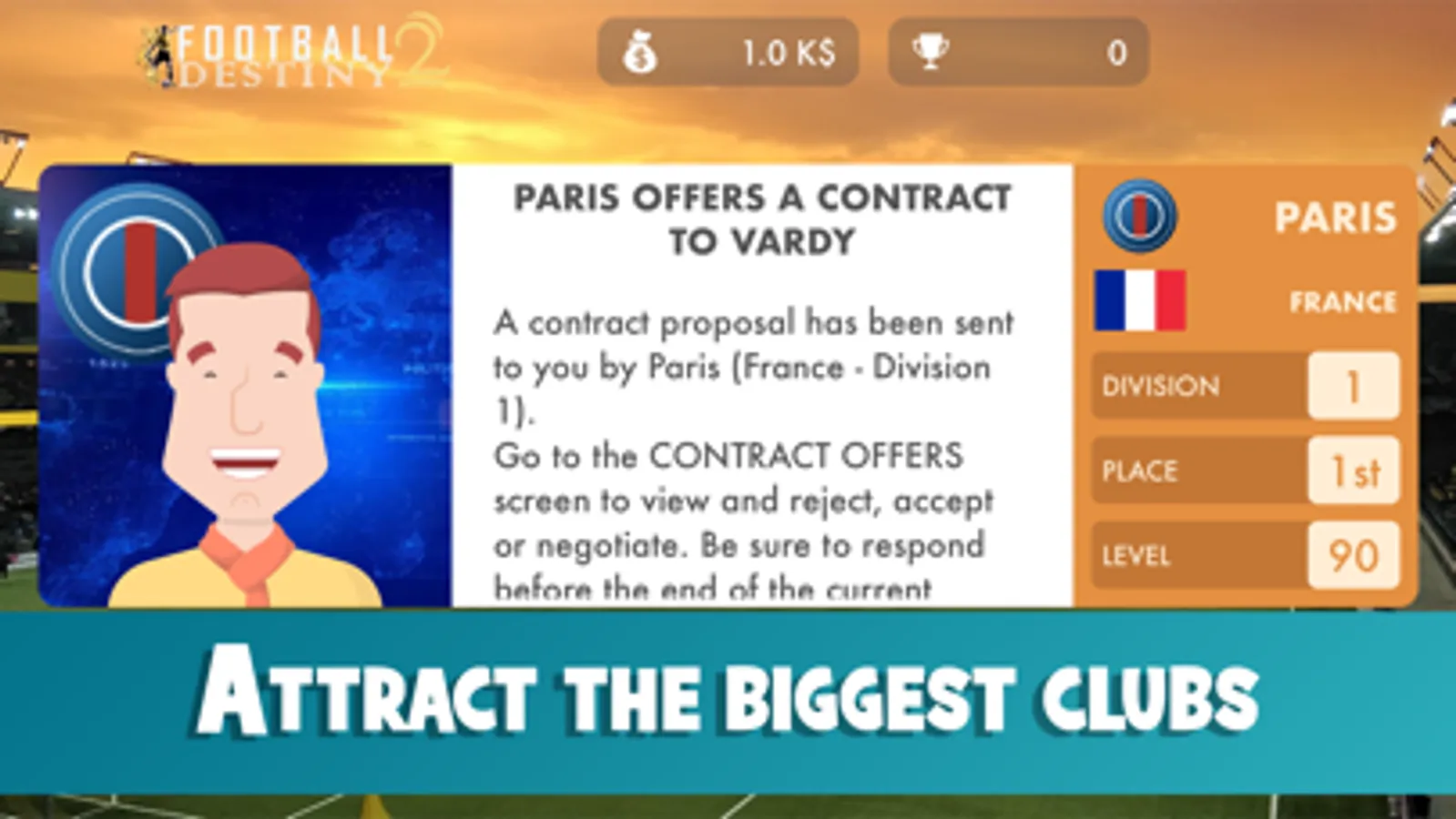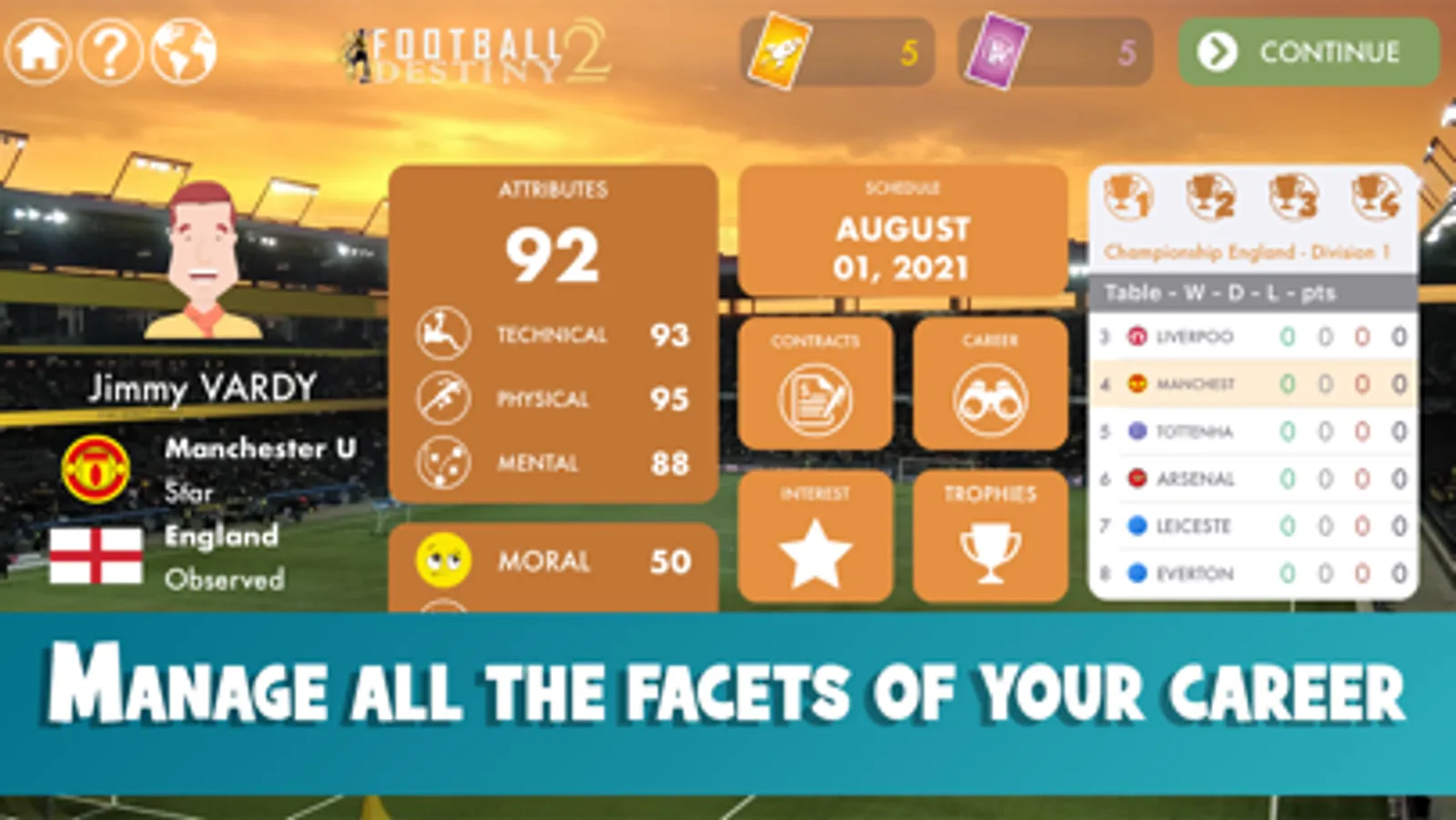 In Football Destiny 2, you start your career in a low-level club with no reputation and low-value attributes. But train hard and make the right decisions on and off the pitch and the doors to the big clubs will open for you.