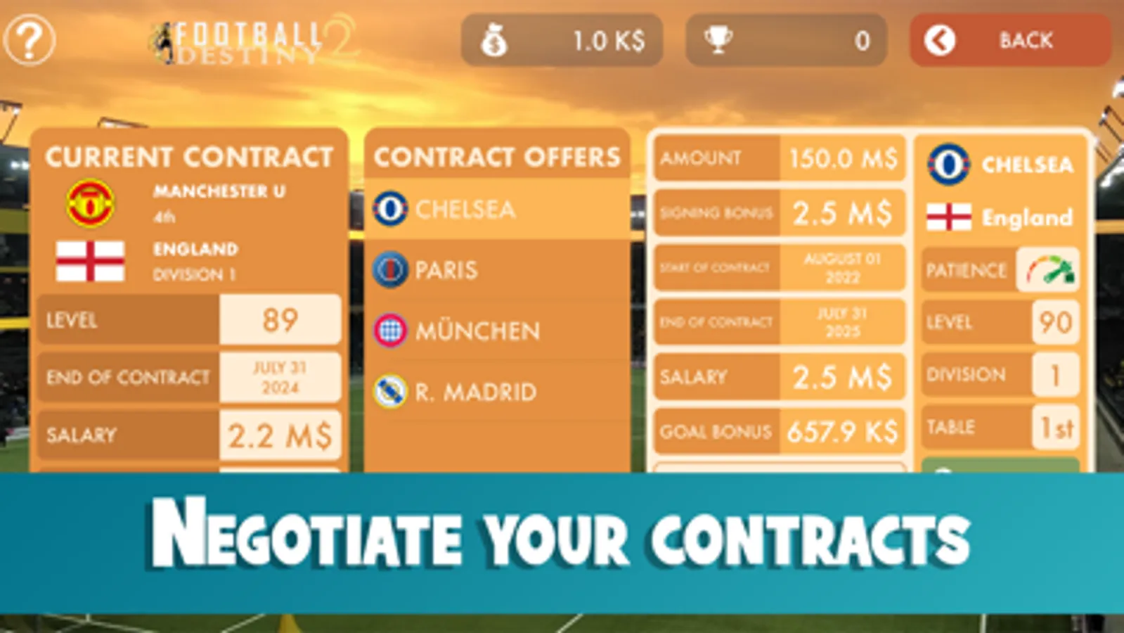 Perform well in matches, get good grades and attract scouts. Get contract offers, negotiate your salary and bonuses.