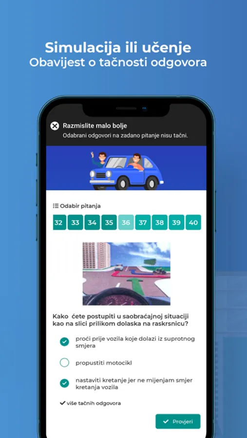 Simulacija ispita predstavlja stvarnu situaciju vozačkog ispita, gdje su tačni odgovori i rezultati prikazani prilikom završetka testa.
