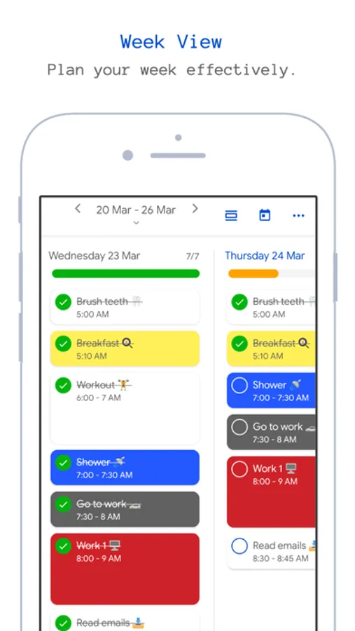 View your agenda as 7 days section view and each section display hour by hour to serve as a daily agenda planner, each hour has a horizontal todo list that displays todos that you need to do in that particular hour, each day section display a progress bar that shows how many remaining todos in your agenda, so by the end of the day you can know if you completed all of your todos, then you can plan for the next day agenda.