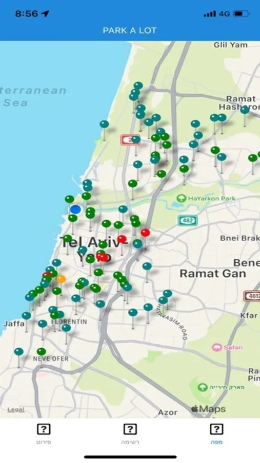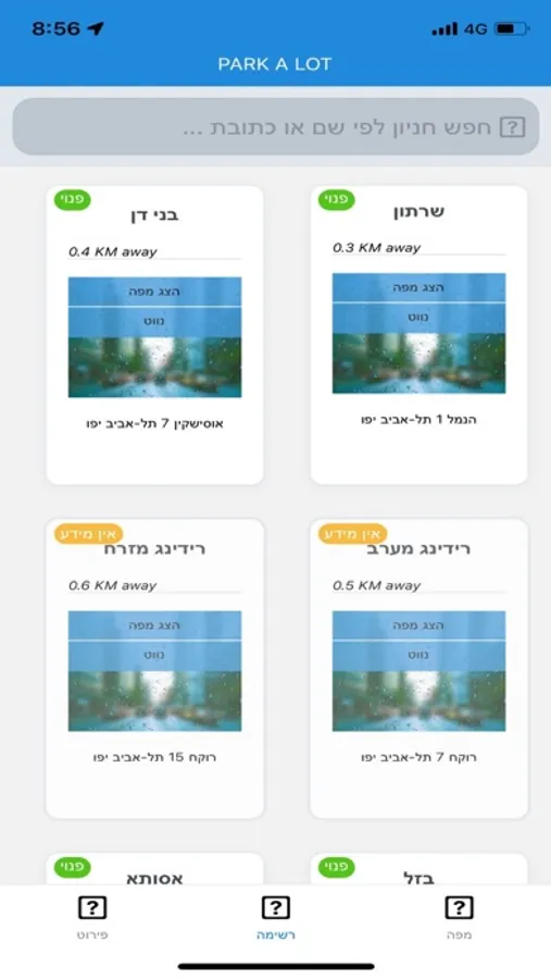 The app provides a map view - that shows all the parking lots on the map, a list view - that shows all the parking lots in a list, when the closest ones are at the beginning of the list.