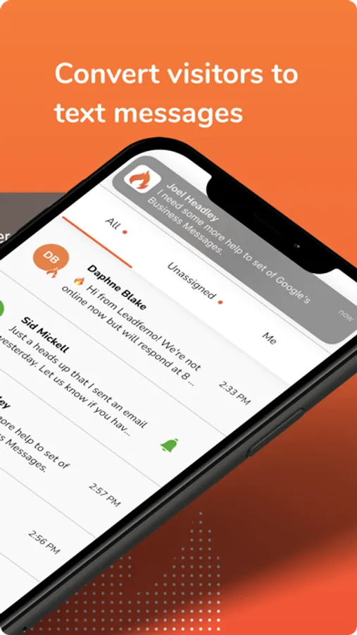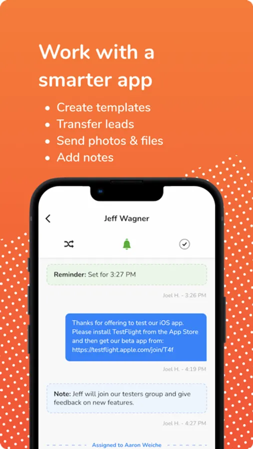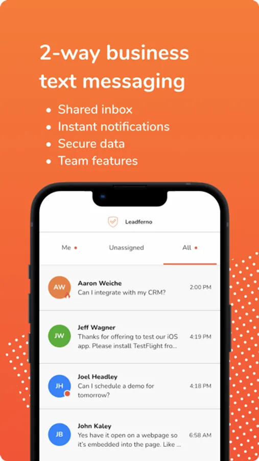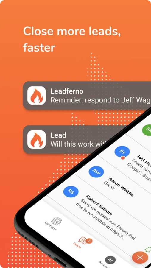 Leadferno allows you to get notifications and respond to leads on the go. The inbox provides a list of all leads and their statuses. The conversation includes internal reminders and notes as well as messaging between your team and your prospects.