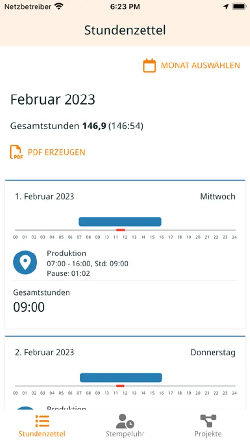 With the time clock, employees have easy and convenient access to their online time sheet. This contains all recorded working times, breaks and projects and can be viewed at any time. This simplifies the documentation and checking of working hours and enables errors to be corrected quickly. The online time sheet also makes it easier to create payslips.
