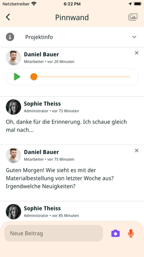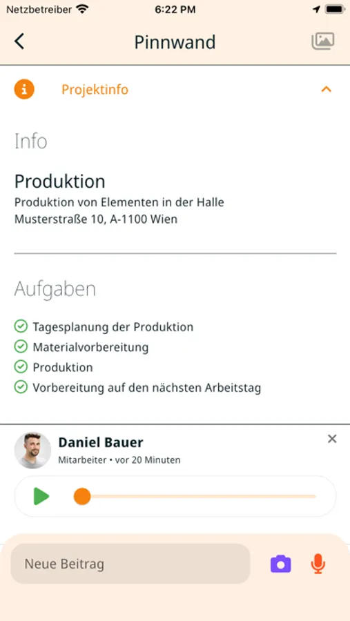 Employees can now view project information and see progress through the app. In addition, they can send documentation, photos and voice messages directly to the respective project. This enables transparent documentation of workflows and progress and facilitates collaboration.
