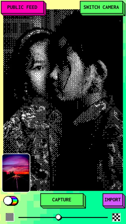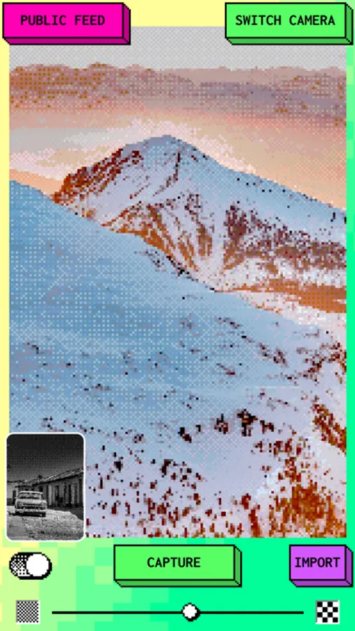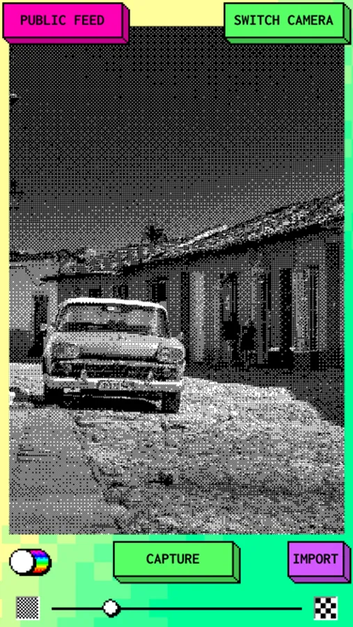 Rustling Broccoli presents PHOTO.EXE, for all your dithered photo needs. Our blazing-fast Bayer dither will impress your friends, and premium users (that's everyone, you're a premium person, aren't you?) can now enjoy colour dithering, too. You can apply the pixelation to photos from your library, or live, using the camera.