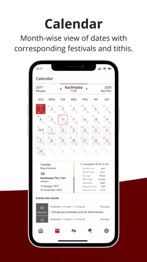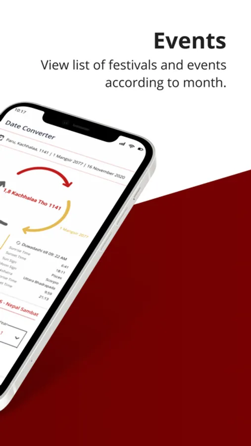 Nepal Sambat Calendar is a mobile based application to help you identify and keep track of all important dates, events, and festivals that fall within Nepal Sambat year. This application has features such as daily events view, monthly calendar view, list of festivals, and date conversion between NS, BS and AD.