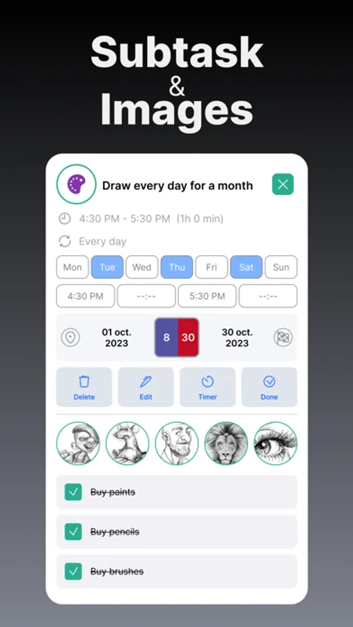 Create tasks with subtasks, notes, and photos. Track progress with a focus timer, achievements, and a daily journal of completed wins.