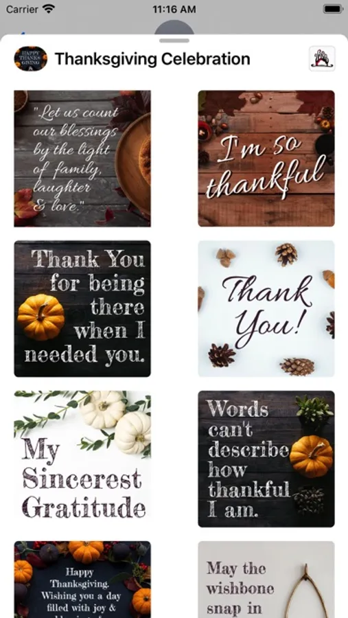 Make your text message more personal today. Send these beautiful Thanksgiving iMessage Stickers pack to your friends and family this year regardless you can gather with them or not. This stickers pack comes with 40 useful thank you greetings and quotes to show your gratitude that you can send to your friends and family, and anyone in your life that you want to show your love and appreciation to, especially during thanksgiving time.