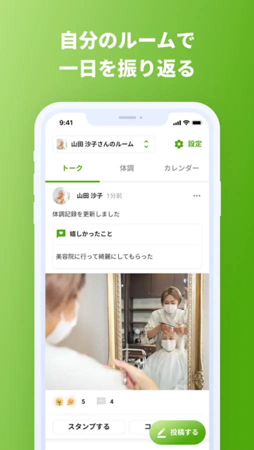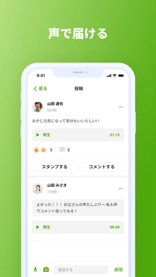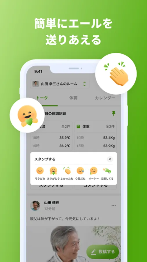 共有された日常に対し、ルームに参加しているメンバーからスタンプやコメントで簡単にエールを送ることができます。もちろん、写真や音声、動画の投稿もできます。