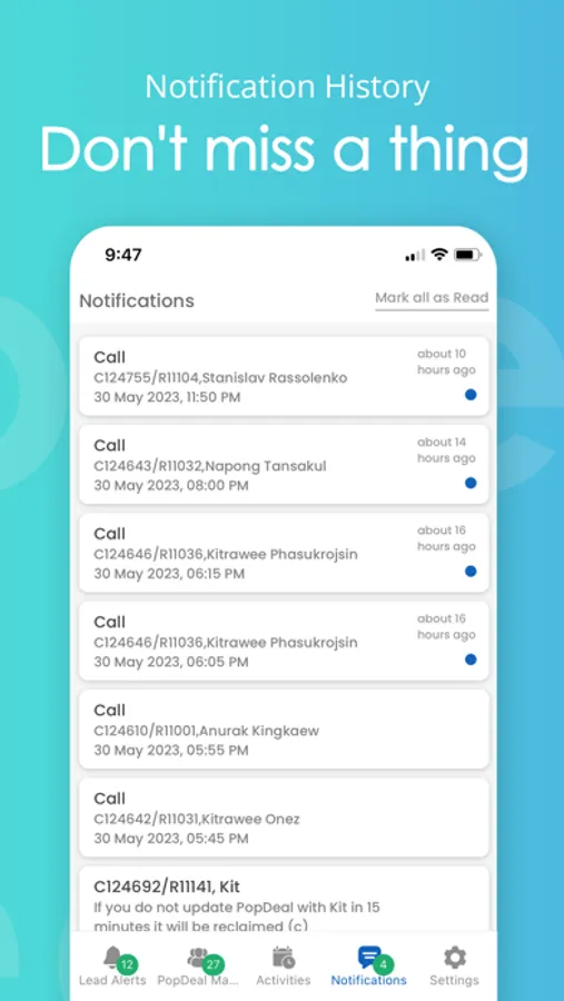 + Notifications - Overview of all notifications including lead alerts, prompts to connect with the client and activity notifications.