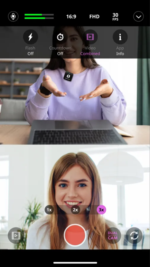 • Dual Camera Mode: Split Screen, Picture-in-Picture, Combined File, Separate Files