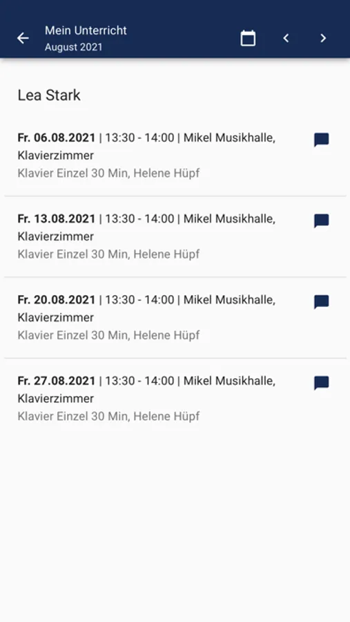 Alle Funktionen zum Austausch von Nachrichten zwischen Lehrkräften, Eltern, Schüler*innen und der Musikschule setzen keinerlei Kontaktinformationen voraus. Die Übermittlung von Nachrichten erfolgt über eine App-interne ID. Zum Chat und Nachrichtenaustausch sind somit keine E-Mail-Adressen oder Handynummern erforderlich.