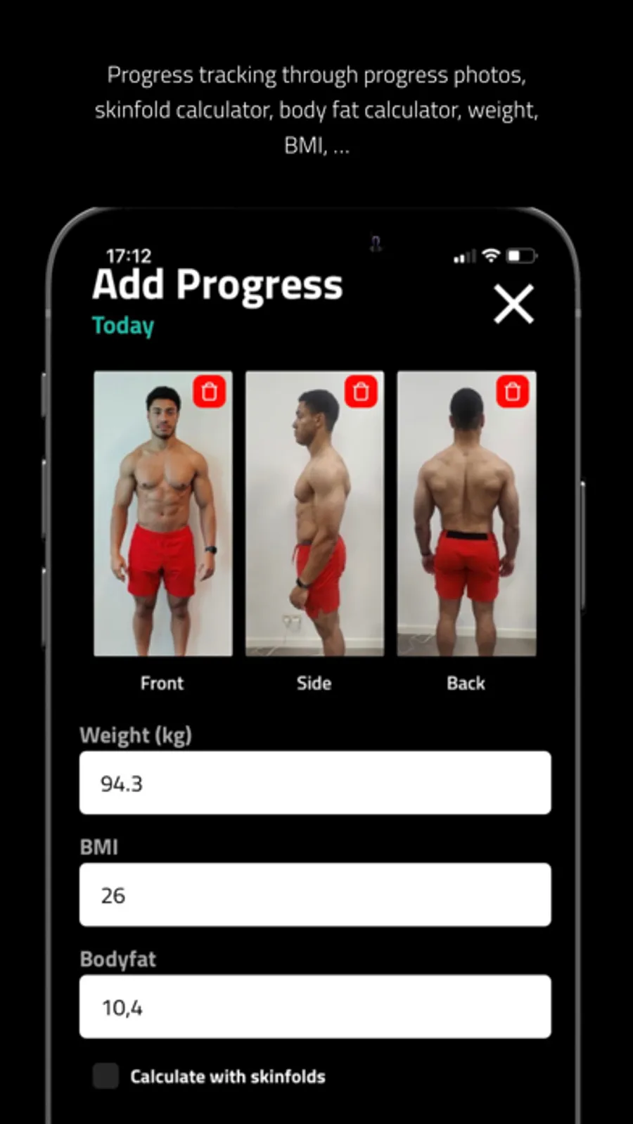 21. Progress tracking through progress photos, bodyfat calculations, skinfold measurements, weight, BMI, …