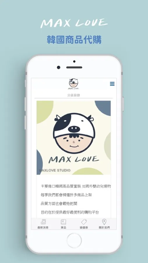 Maxlove studio主要進口韓國高品質童裝及國外嬰幼兒選物,每季我們都會精選許多商品上架,品質方面也會嚴格把關,目的在於提供最好最便利的購物平台,讓平時忙碌的爸媽也可以輕鬆為寶貝們挑選適合的商品。我們也不定期推出限時團購及限時優惠,即時推播不漏訊息,我們會努力,給予最好的服務,陪伴您度過美好的購物時光。