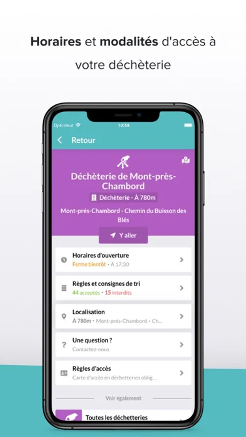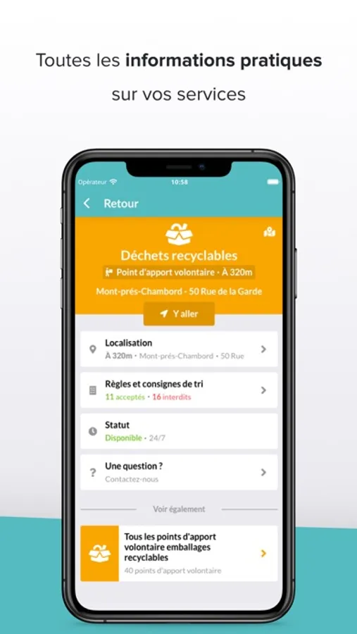 L’application recense les points de collecte les plus proches de vous grâce à la géolocalisation, et vous donne les règles et consignes de tri pour le verre, les biodéchets, les ordures ménagères et les emballages. Vous découvrirez peut-être des lieux où donner, comment opter pour le compostage et que faire des piles, médicaments, etc. Enfin, vous n’aurez plus de doute sur les horaires d’ouverture des déchèteries : la bonne information est dans l’application !