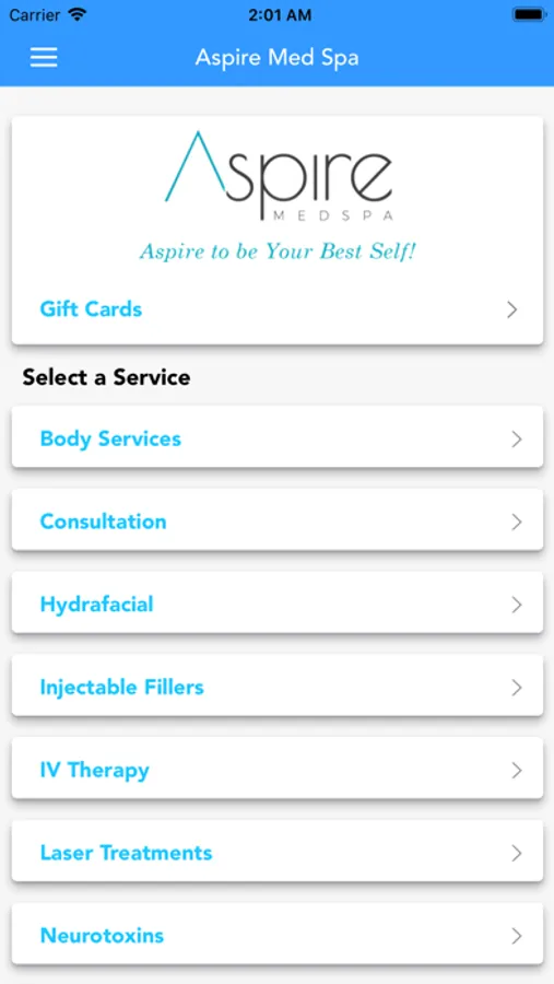 Welcome to Aspire Med Spa, here you'll be able to login into your Aspire account, create future appointments, check upcoming appointments, do self- checkins and see paid invoices.