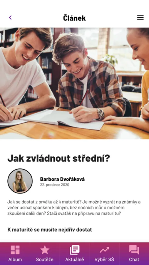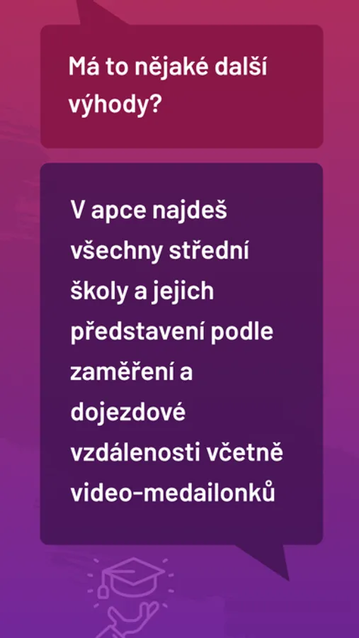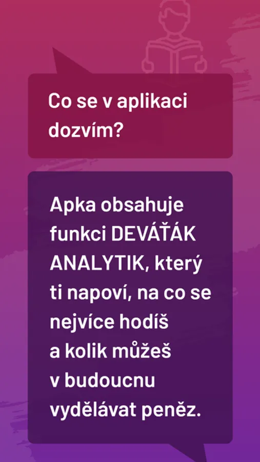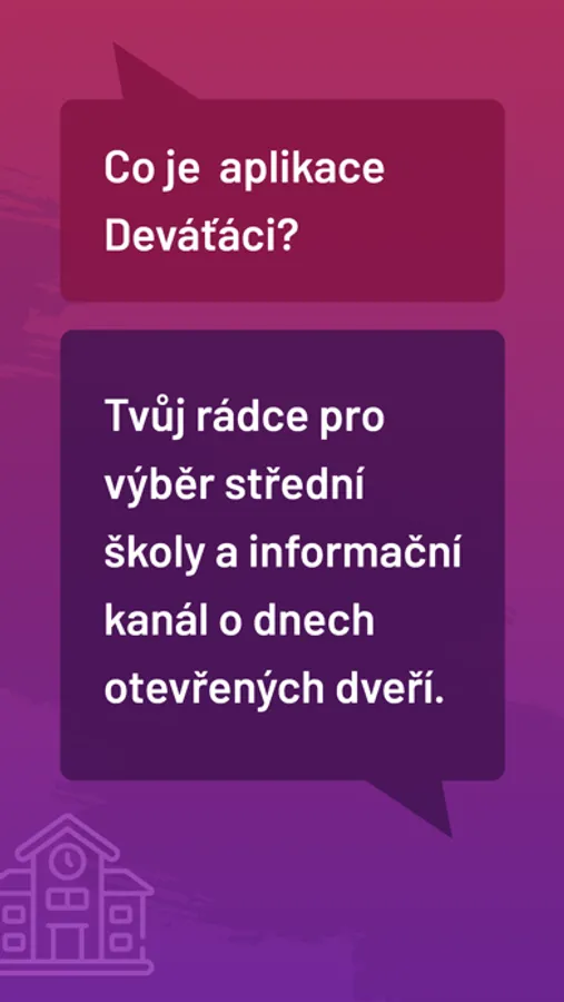 Stáhněte si aplikaci Deváťáci, založte si třídu, spojte se a chatujte se svými spolužáky, získejte zdarma STUDENT kartu nabušenou výhodami, čtěte zajímavé články a mějte jasno při výběru střední školy.