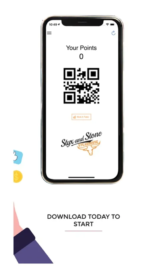 Using the app by scanning the QR code in conjunction with the Tevalis Point of Sale system at Styx and Stone Restaurant will allow you to earn and redeem loyalty rewards based on your purchases.