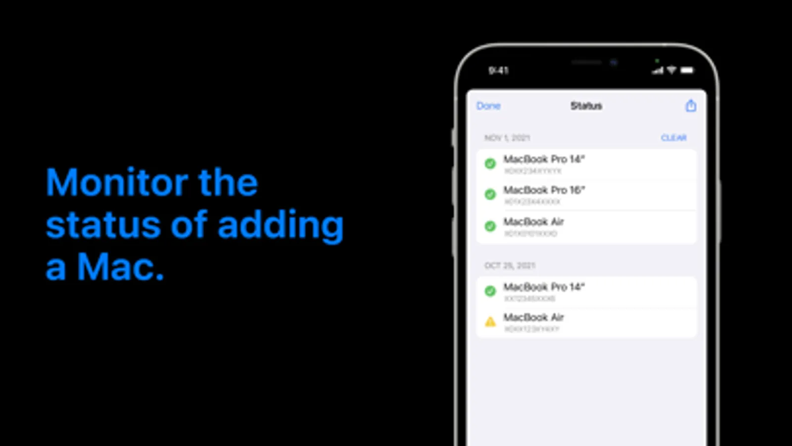 Apple Configurator for iPhone makes it easy to add any iOS device running iOS 16 or later or any Mac with the T2 Security Chip or Apple silicon running macOS Monterey or later to your organization in Apple School Manager, Apple Business Manager, or Apple Business Essentials so that you can take advantage of Automated Device Enrollment.