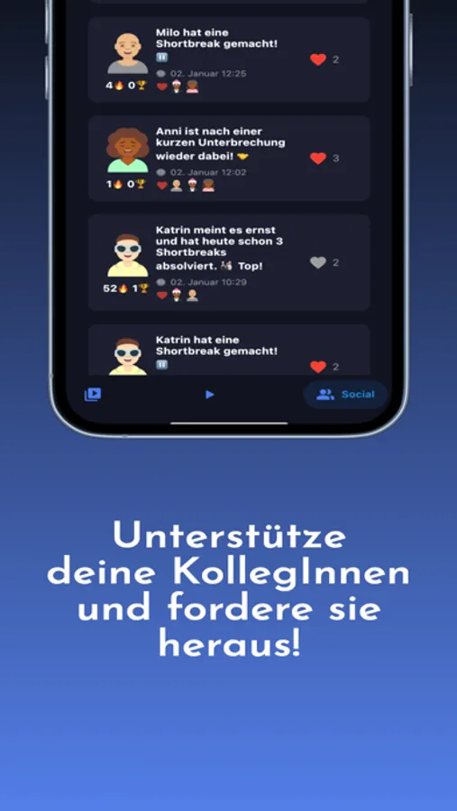 Shortbreak bietet genau das: Kurze Bewegungssessions von unter 3 Minuten, die von zertifizierten Coaches geleitet werden. Mit Shortbreak bleibst du bewusster und unterstützt deinen Körper dabei, sich täglich zu bewegen - ohne dabei wichtige Zeit zu verlieren. Shortbreak verbessert dein Energielevel und deine Konzentration und hilft dir, aus Bewegung eine Gewohnheit zu machen.