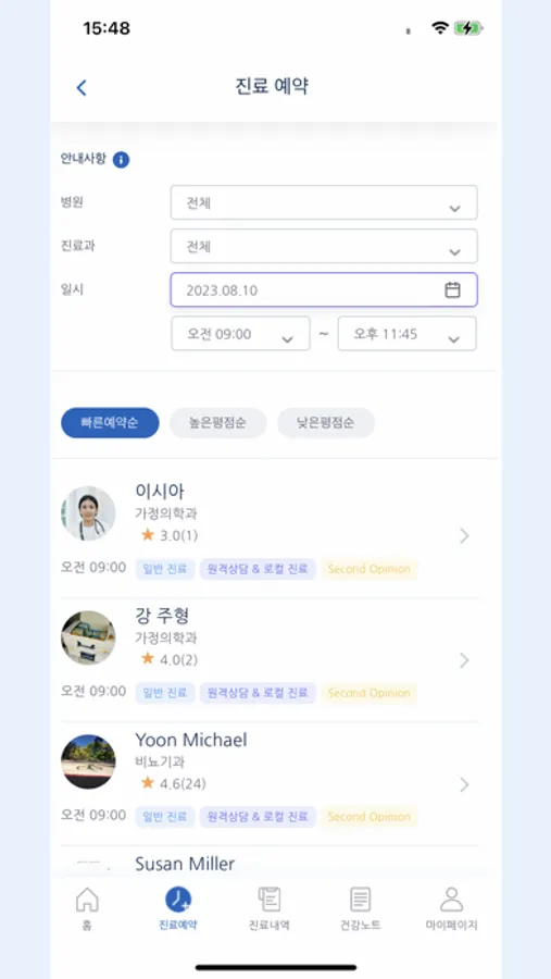2. 진료예약에서 원하는 진료과를 선택한 후 지정된 의사의 목록을 확인하고 선택된 의사의 스케줄을 확인해서 원하는 날짜의 원하는 시간을 선택해서 진료예약을 할 수 있습니다.