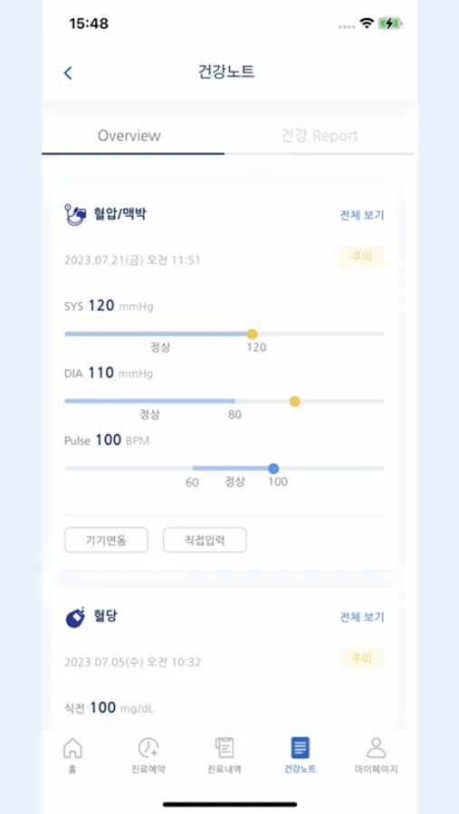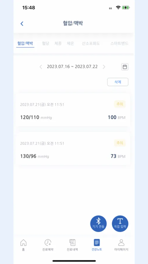 본 앱을 통해 생체정보(혈압, 체중, 산소포화도, 혈당, 체온)를 등록/관리할 수 있고