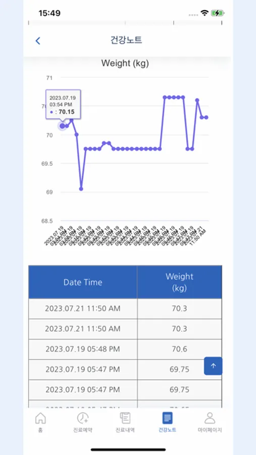 3) 어플을 실행하고 로그인 후 하단 메뉴 건강노트를 클릭