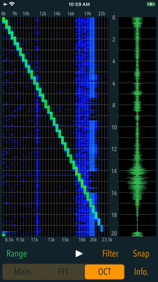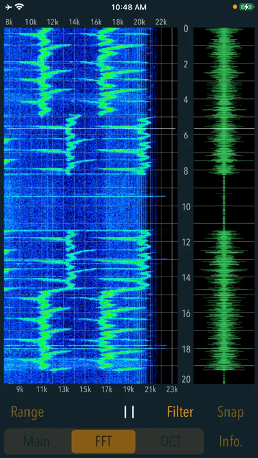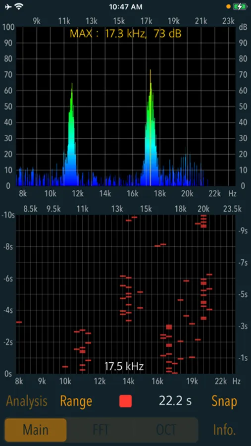 After measurement in Main mode, tap the Analysis button to perform spectrogram analysis. Tap FFT or OCT button to display the spectrogram by FFT or octave band analysis.