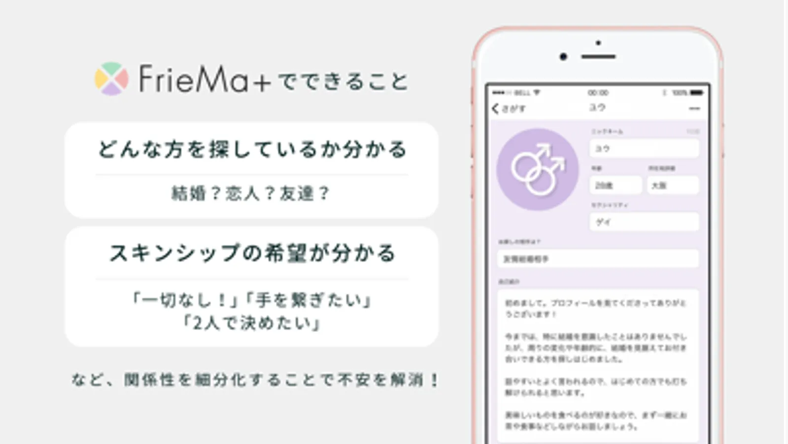 フレマは友情結婚などの【恋愛関係じゃないパートナーを探せる】セクシャルマイノリティの方のためのマッチングアプリです。