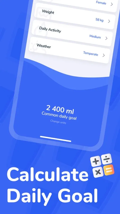 • Calculate your daily hydration goal based on your body type, weight, height, age and daily activity