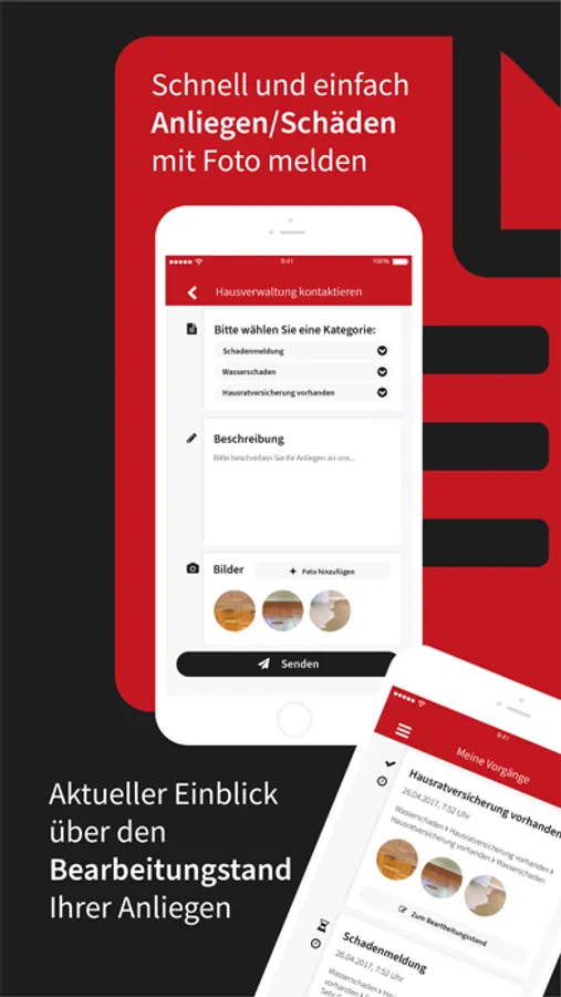 Als Mieter oder Eigentümer können Sie Schäden oder Anliegen direkt mit Fotos über unsere App melden. Ihre Anfragen stehen unseren Mitarbeiten dann zur Verfügung und können auch an Handwerksbetriebe weitergeleitet werden.