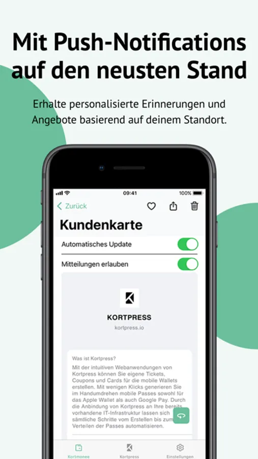 Die Abfahrtszeit deines Zuges, ein neuer Rabattcode deines Lieblingsshops oder der Punktestand deiner Bonuskarte – du möchtest immer gut informiert sein und am Besten nie etwas verpassen. Kortmonee unterstützt Push Notifications und kann dir auch basierend auf deinem Standort Erinnerungen schicken – so bist du immer auf dem neusten Stand.