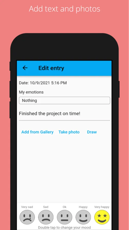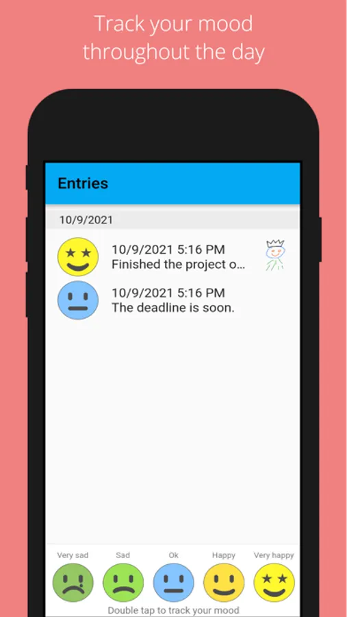 Track your mood and emotions throughout the day. Add text notes, photos, and hand drawings that describe what influenced you.