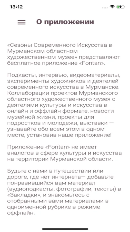 «Сезоны Современного Искусства в Мурманском областном художественном музее» представляют бесплатное приложение «Fontan» Подкасты, интервью, видеоматериалы, эксперименты художников и деятелей современного искусства в Мурманске. Коллаборации проектов Мурманского областного художественного музея с деятелями культуры и искусства в онлайн и оффлайн формате, новости музейной жизни, проекты для подростков и молодежи, выставки — узнавайте обо всем этом в одном месте, установив наше приложение! Приложение «Fontan» не имеет аналогов в сфере культуры и искусства на территории Мурманской области. Будьте с нами в путешествии или дороге, где нет интернета— добавьте понравившийся вам материал (аудиоподкасты, фотографии, тексты) в «Закладки», и знакомьтесь с отобранными вами материалами в одноименной рубрике в режиме оффлайн.