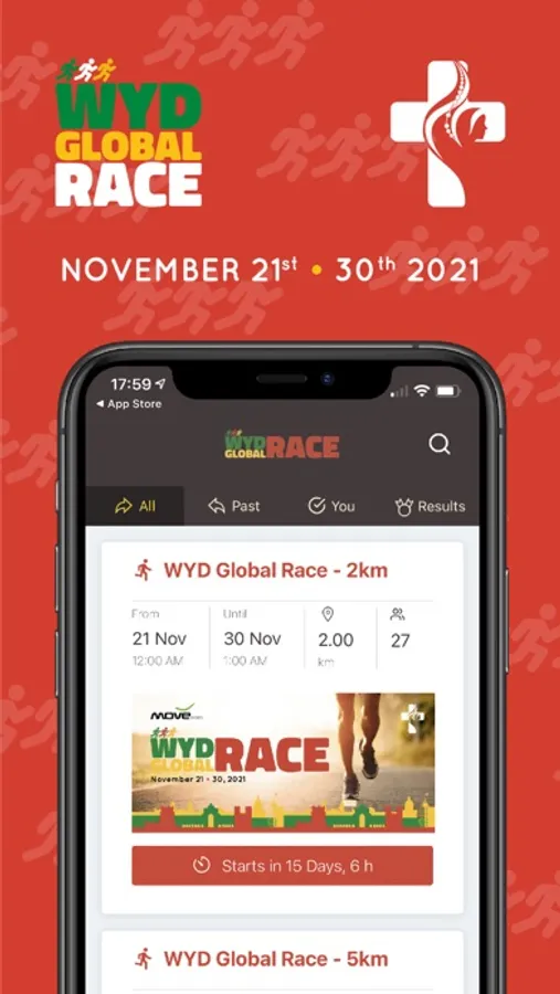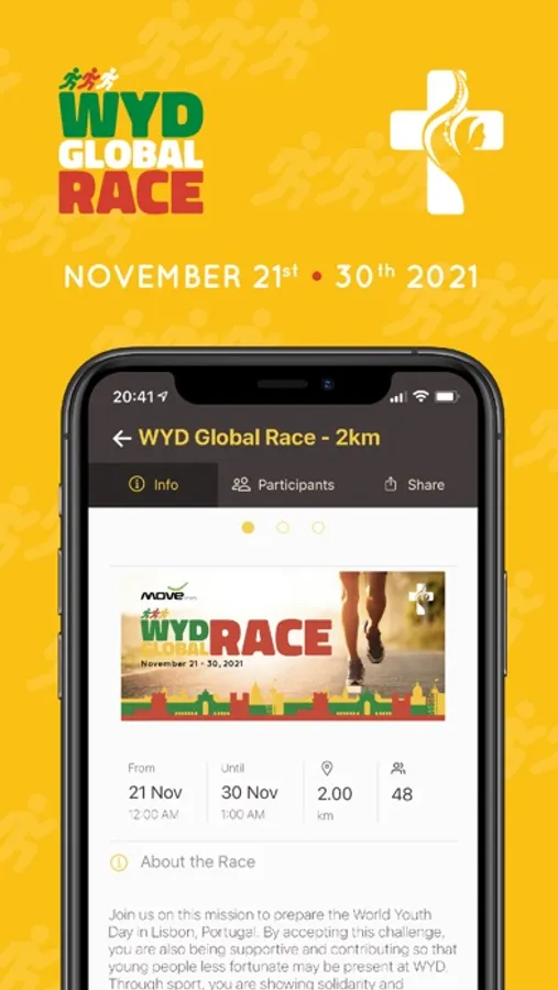 Through the WYD Global Race App, you participate in a worldwide race. The first race starts from November 21 to November 30, 2021. Run 2.5 or 10 km and be a part of a global movement running to build a better world.
