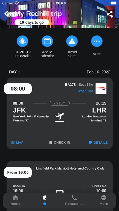 The Worldgo app brings together all the relevant and useful information you need to make the most of your trip. Access all your trip information in one place, share your trip details with your contacts and view family, friends' and colleagues' trips they have shared with you.