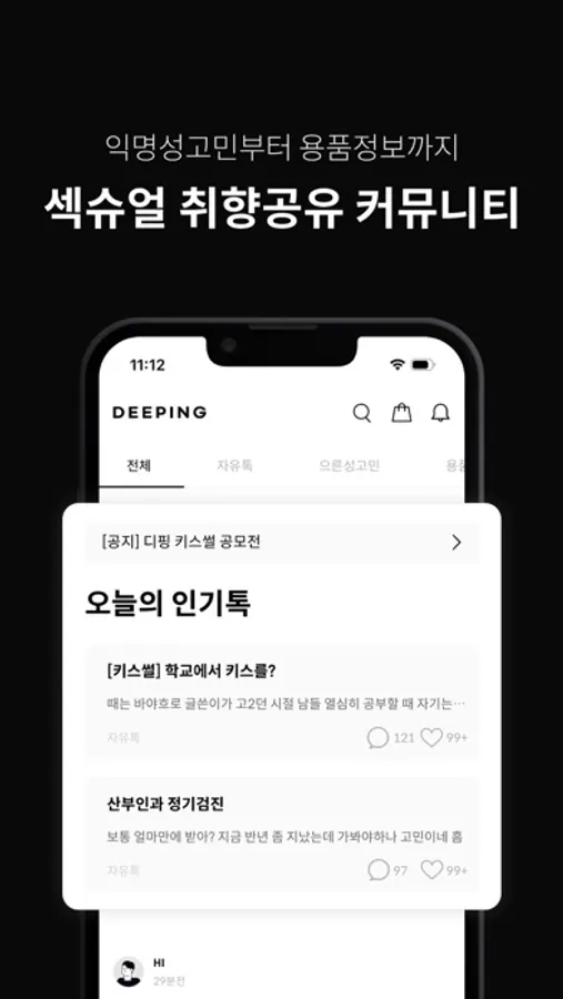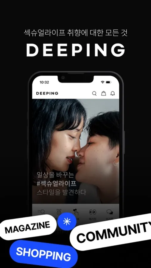 - 더 이상 혼자 고민하지 마세요. 섹슈얼한 일상속 당신의 고민과 질문들을 세상에 없던 공간, 디핑 커뮤니티에서 묻고 답해보세요. 피임, 성병, 나를 사랑하는 법 모두를 공유할 수 있습니다.