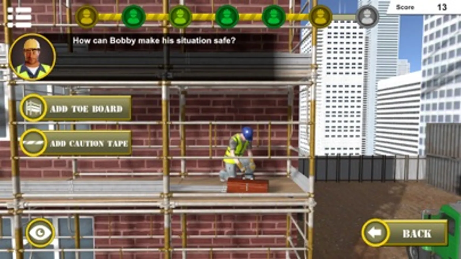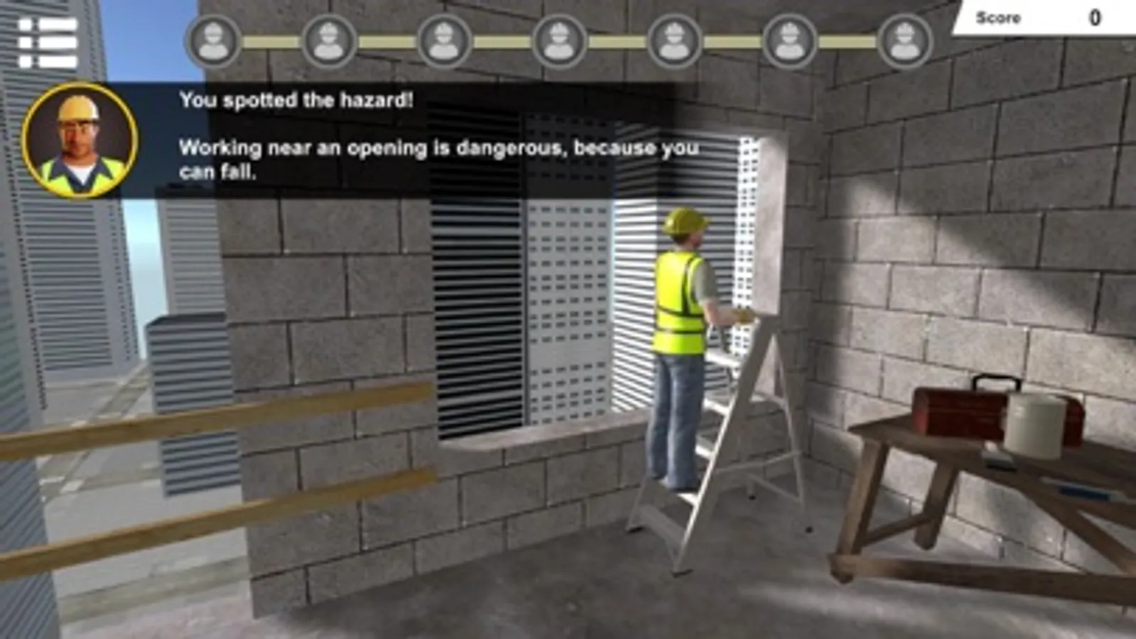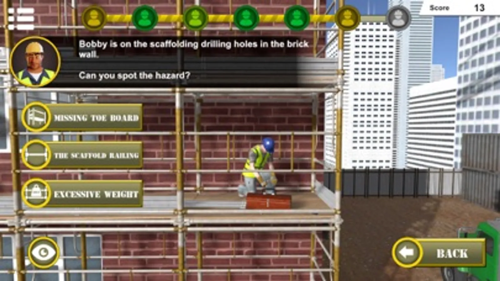 HazApp includes four unique chapters that each focus on one of OSHA’s four main construction hazards: Falls, Struck By, Caught In/Between, and Electrocution. In each chapter, you encounter multiple scenarios on the 3D construction site where there are hazardous situations. Earn points by identifying the hazard and providing the best solution to make the situation safe for all workers. Play through multiple times to apply what you’ve learned and try to beat your high score!