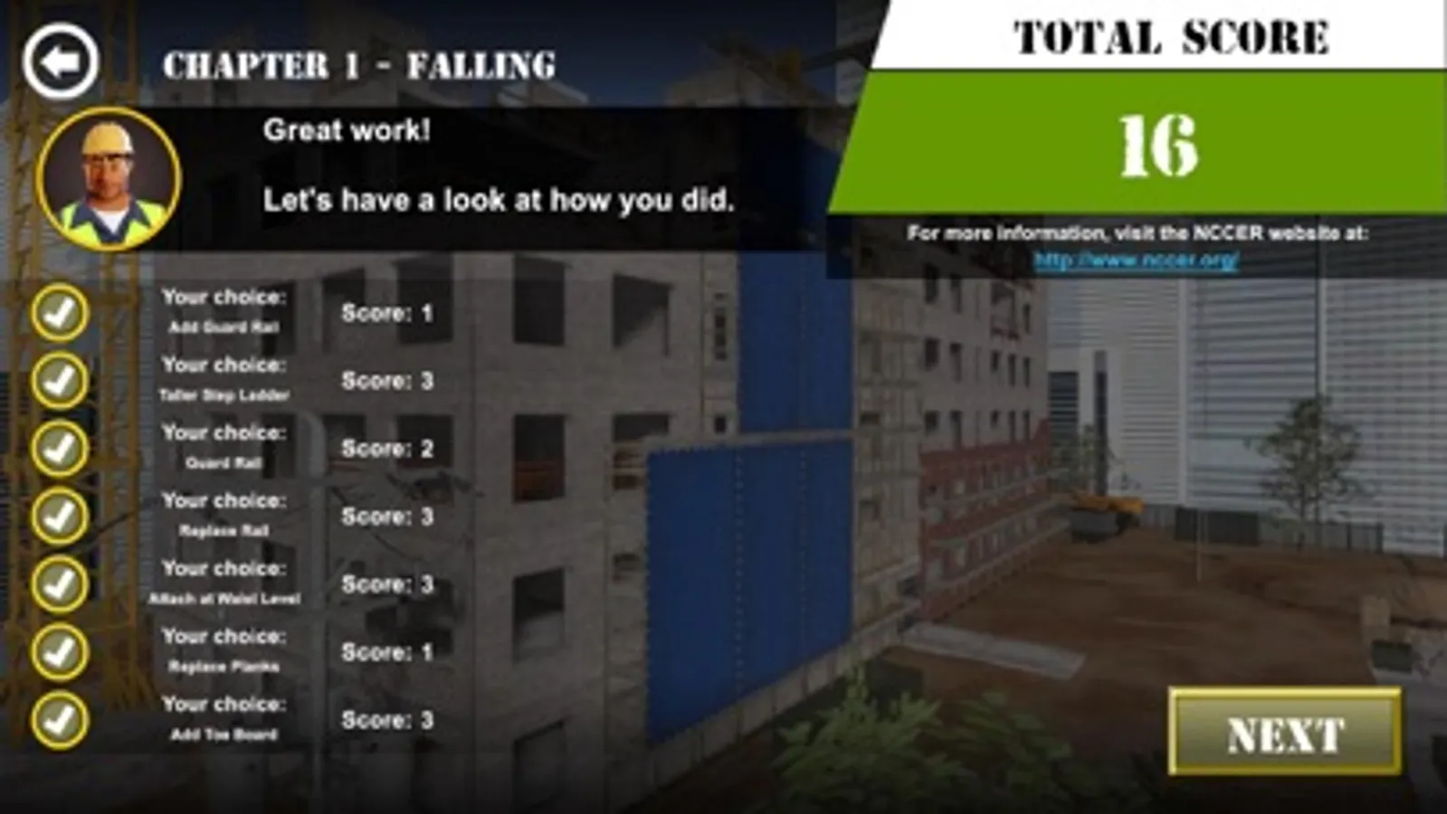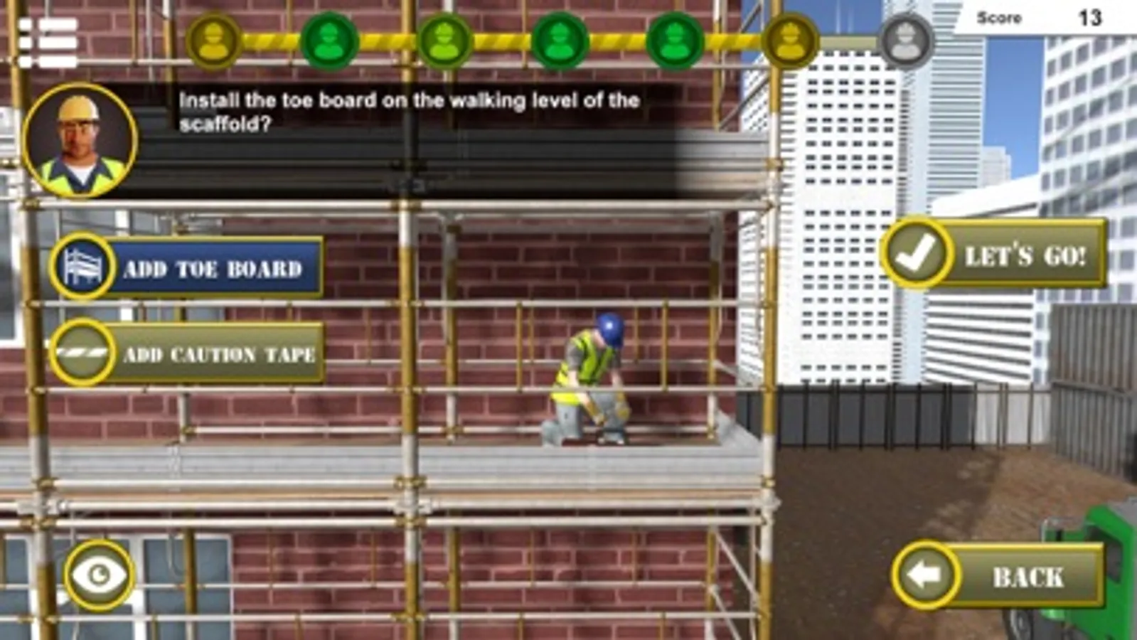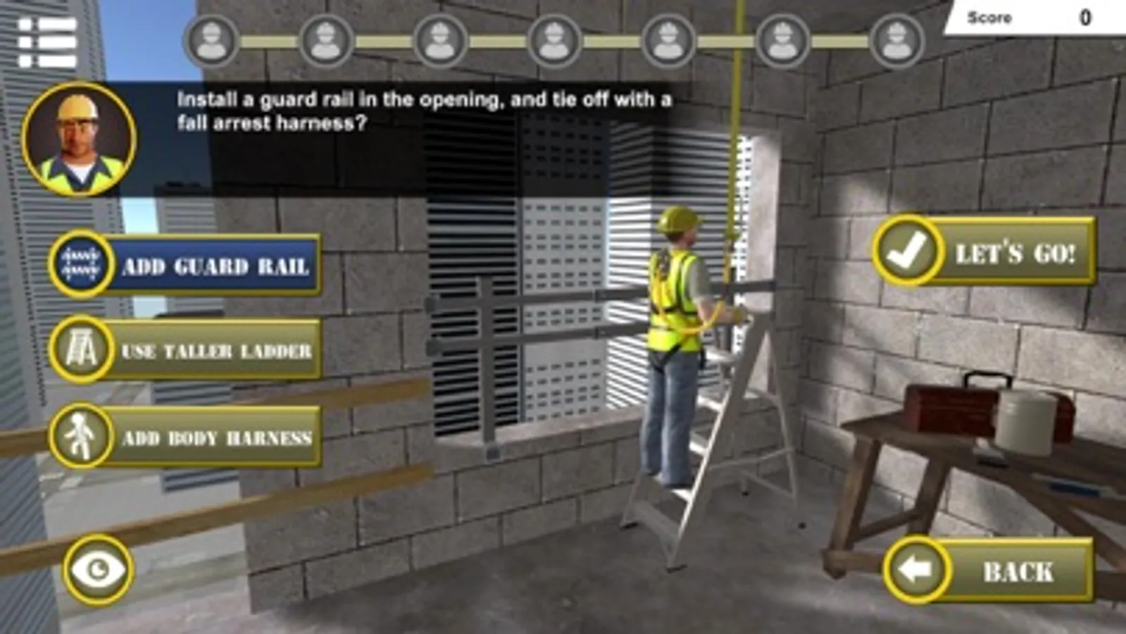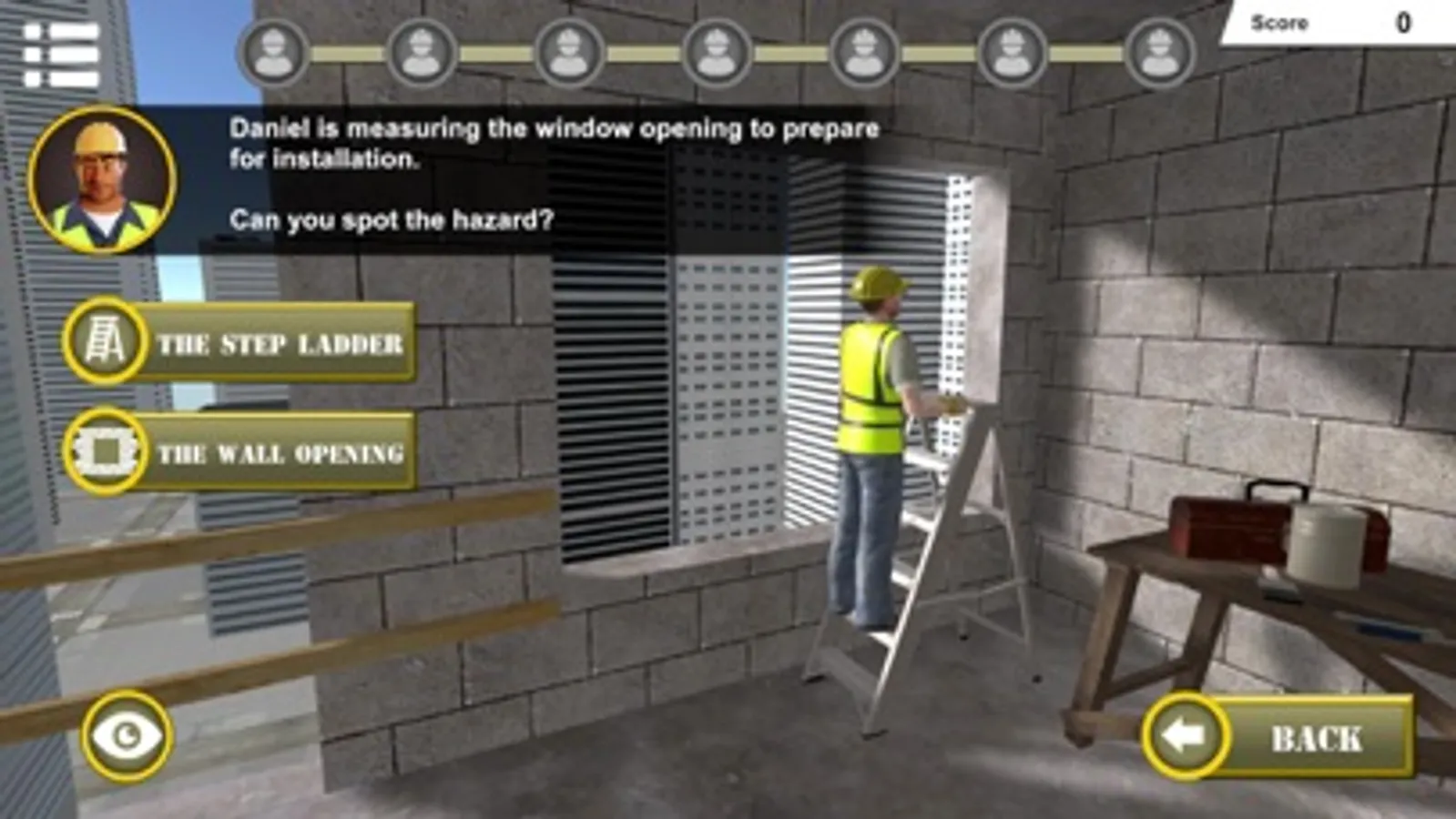 HazApp includes four unique chapters that each focus on one of OSHA’s four main construction hazards: Falls, Struck By, Caught In/Between, and Electrocution. In each chapter, you encounter multiple scenarios on the 3D construction site where there are hazardous situations. Earn points by identifying the hazard and providing the best solution to make the situation safe for all workers. Play through multiple times to apply what you’ve learned and try to beat your high score!