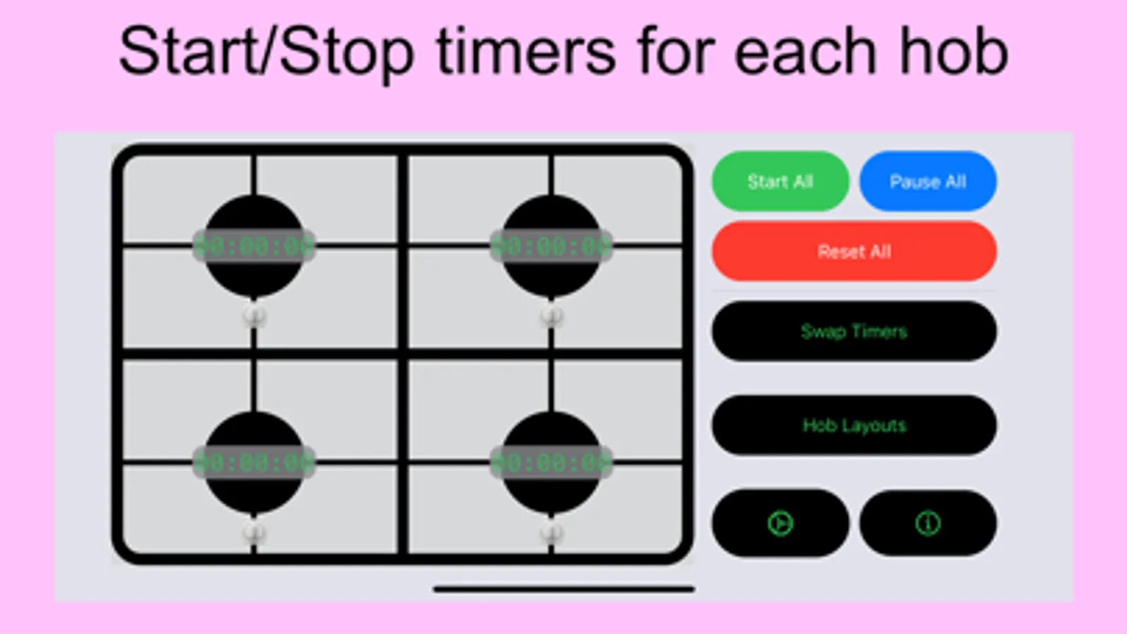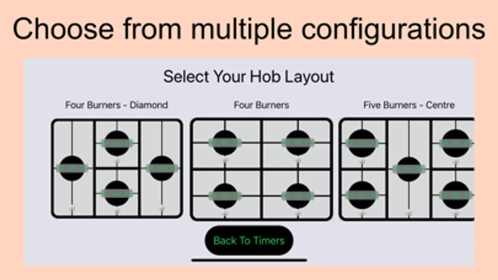 Then KitchenHob Timer is for you - You can allocate a timer to every burner on your hob, using a visual representation of your hob configuration. This makes it easier to track all the components that your are cooking for your meal.