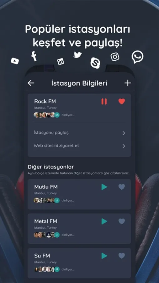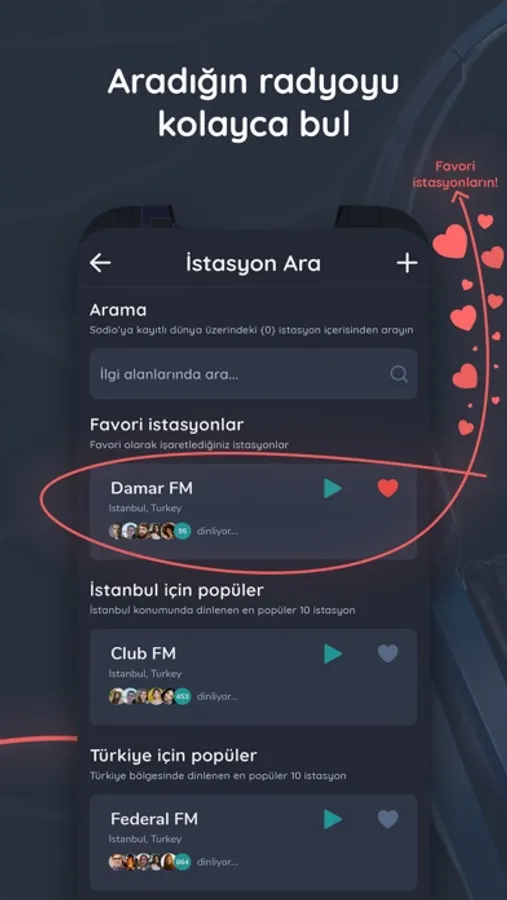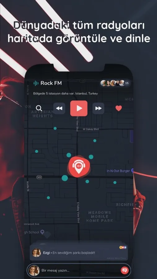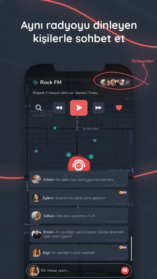 Harita üzerindeki mavi noktaların her biri bir radyo istasyonunu temsil eder. Sadece ekranı kaydırarak ve gezinerek istediğiniz bölgedeki istasyona anına katılabilir ve dinlemeye başlayabilirsiniz. Beğendiğiniz istasyonları favorilerinize ekleyerek, favori istasyon listenizi oluşturabilirsiniz. Aynı zamanda dilediğiniz radyo istasyonunu sosyal medyada ya da arkadaşlarınız ile paylaşabilirsiniz.