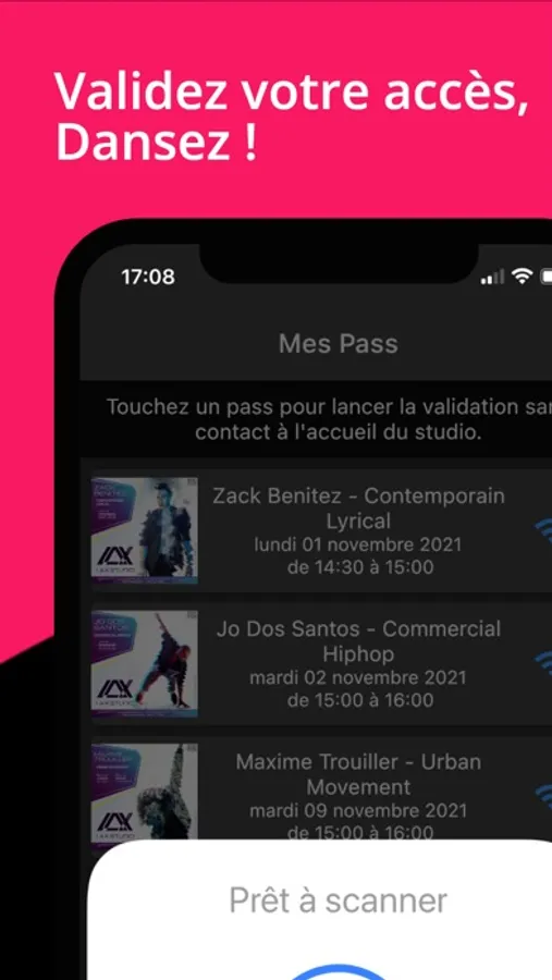 Vous accédez ensuite à vos cours via le check-in sans contact (votre smartphone vous sert de pass d'accès à votre arrivée au studio).