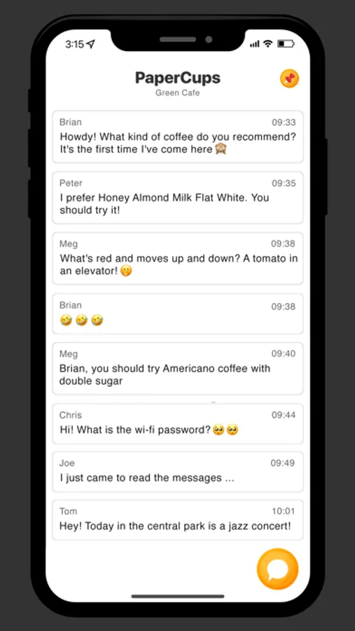 Chat with those around you and be updated with the latest events. From the best thing on the menu to the funniest joke or just a stranger saying hello, you are four digits away. Enter the code of your location and enjoy!