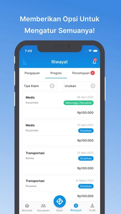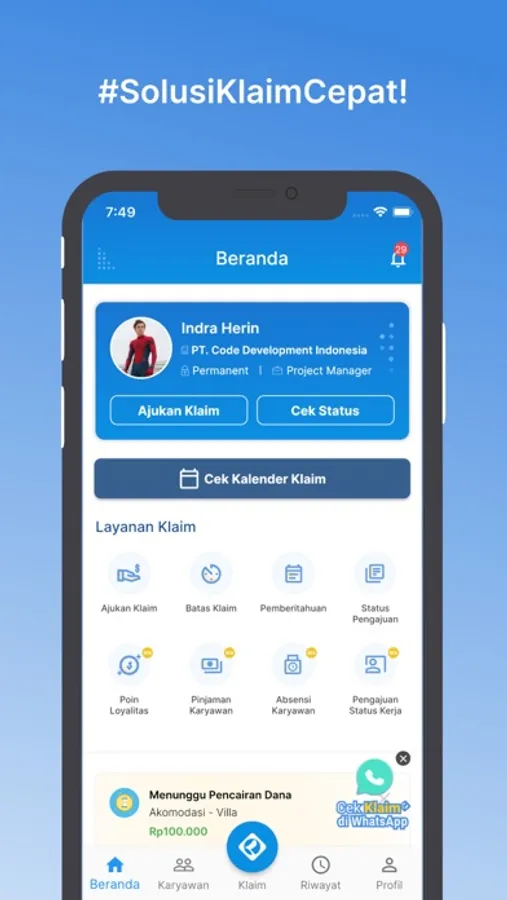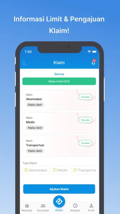 Klaim merupakan aplikasi Employee Benefit (e-Claim) yang ditujukan untuk perusahaan dan karyawan dalam menentukan kebijakan reimbursement yang berlaku. Tahapan pengajuan yang dilakukan secara langsung oleh karyawan. Pada prosesnya Klaim terintegrasi dengan beberapa Platform seperti Website (Admin Perusahaan) WhatsApp & Mobile App (Karyawan) untuk mendapatkan pengalaman terbaik dalam proses pengajuan klaim. Sekarang anda dapat melakukan pengajuan sesuai dengan limit dan regulasi yang ditentukan oleh perusahaan dan pastikan semua prosesnya berjalan secara transparan.