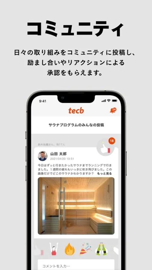 tecbではコンディショニングを継続し自然と習慣化できるようにコミュニティ機能が後押しをしてくれます。ぜひ会社の同僚や家族と一緒に取り組んでください。